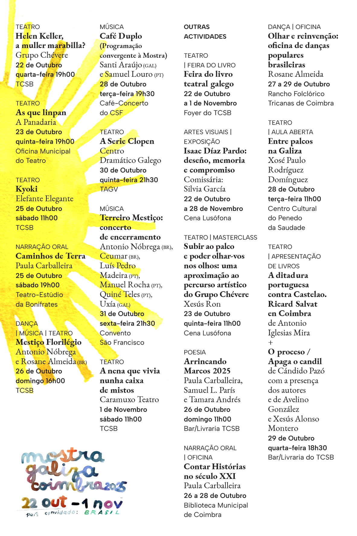 Realizada na sequência da Mostra de Teatro Galego que teve lugar em 2023, a Mostra Galiza assume-se como um projecto bienal que visa aproximar as comunidades artísticas e os públicos da Galiza, de Portugal e dos restantes países da Comunidade dos Países de Língua Portuguesa. O novo formato reforça a abertura a outras artes e passa a incluir um país lusófono convidado em cada edição, contribuindo para integrar a Galiza nos circuitos de intercâmbio no espaço da CPLP. Desta vez, é o Brasil.O programa estende-se até 1 de Novembro, acontece em vários espaços da cidade e inclui nove espectáculos, duas oficinas, uma exposição, uma sessão de poesia, a apresentação de dois livros, uma masterclass, uma aula aberta, e uma feira do livro teatral. Entre os/as artistas convidados/as estão, para além do Chévere, A Panadaría, Paula Carballeira, Antonio Nóbrega e Rosane Almeida, Santi Araújo e Samuel Louro, Centro Dramático Galego, Elefante Elegante e Caramuxo Teatro. Reunidos em residência artística a convite da Mostra, Uxía (Galiza), Antonio Nóbrega e Ceumar (Brasil) e Luís Pedro Madeira, Manuel Rocha e Quiné Teles (Portugal) construirão o concerto “Terreiro Mestiço”, uma grande festa musical que partilharão com o público a 31 de Outubro, pelas 21h30, no Grande Auditório do Convento São Francisco.A Cena Lusófona e A Escola da Noite são estruturas financiadas pela Câmara Municipal de Coimbra e pela Direcção-Geral das Artes, contando ainda com o apoio da Xunta de Galicia e do programa Ibercena para esta iniciativa. A programação detalhada da Mostra pode ser consultada no blogue d'A Escola da Noite, em https://weblog.aescoladanoite.pt/mostra-galiza-coimbra-2025/